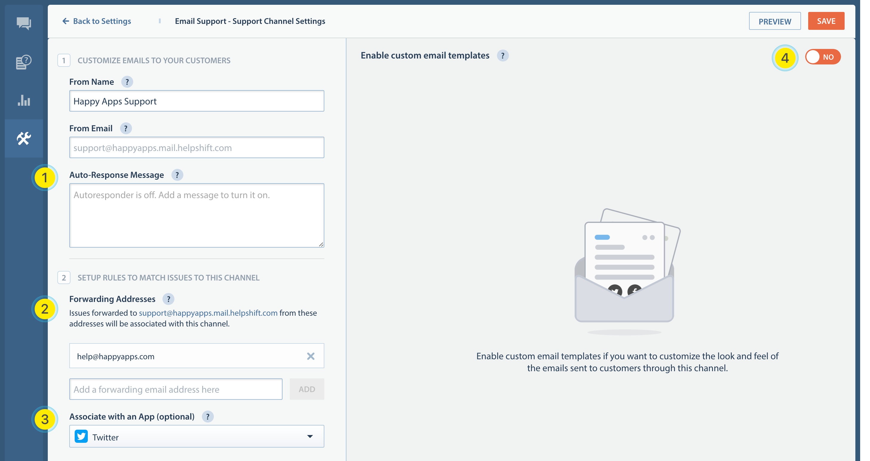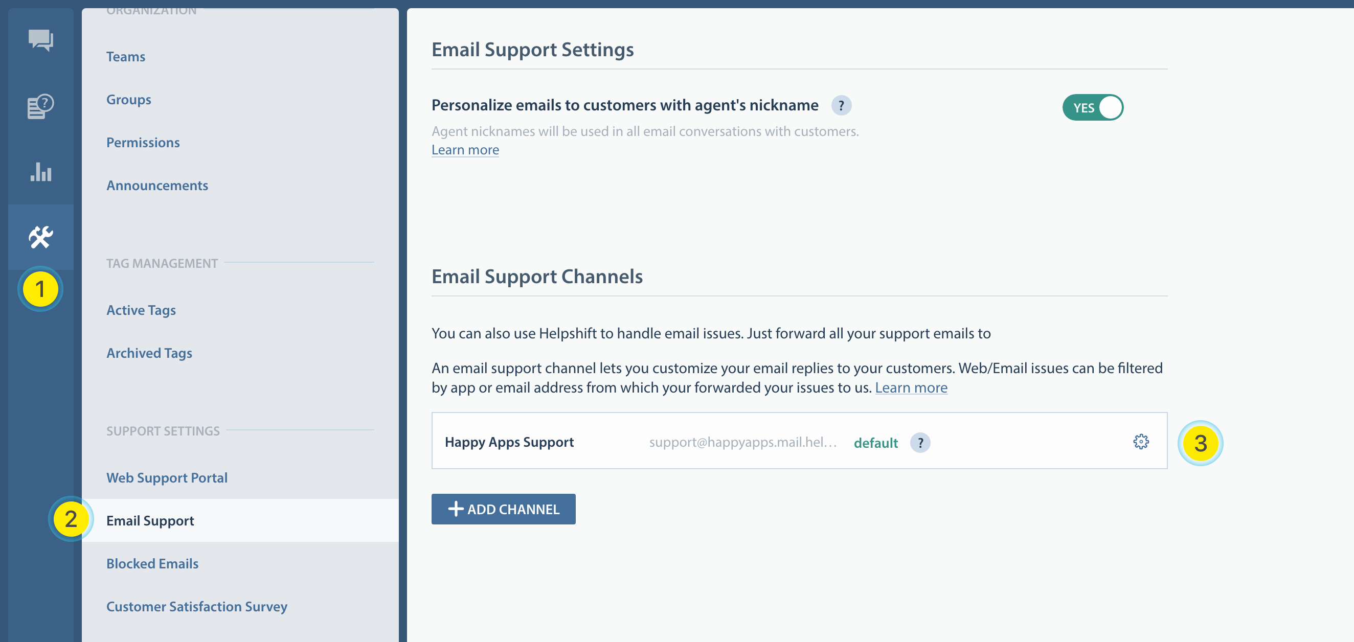 | 2 Forwarding addresses | Emails forwarded to support@<your-domain>.mail.helpshift.com will be associated with this support channel |