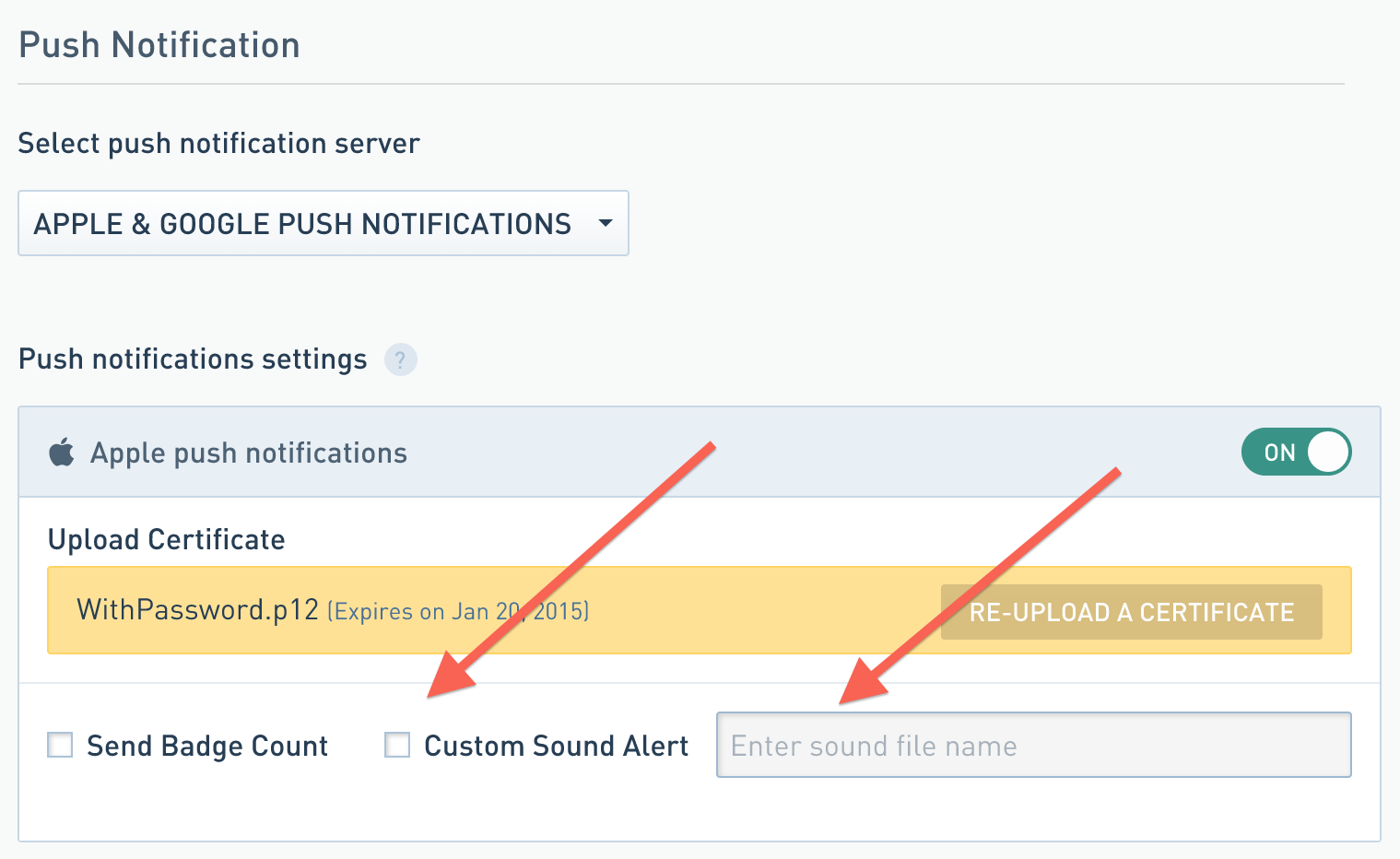 • If custom sound alerts are not working, make sure that Custom Sound Alert is selected under App Settings > Push Notifications. Also, provide the sound file name (with the file extension) exactly as the file name used in your app.