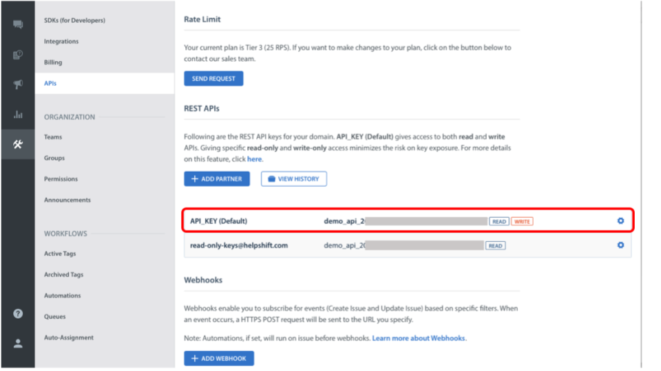 Note: If you do not have the integrations feature enabled, please contact Helpshift to enable the integrations API.